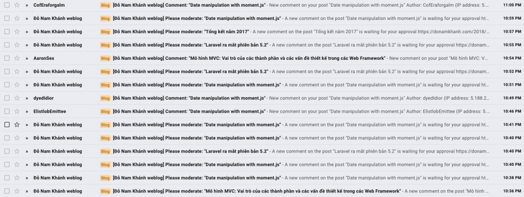 Cũng không biết tại sao website cài reCaptcha rồi mà vẫn bị spam đều đều. Mà khó chịu nhất là từ lúc mình enable lại chức năng thông báo có bình luận mới qua email thì inbox của mình suốt ngày cứ "tinh tinh" (âm báo có mail mới từ điện thoại).