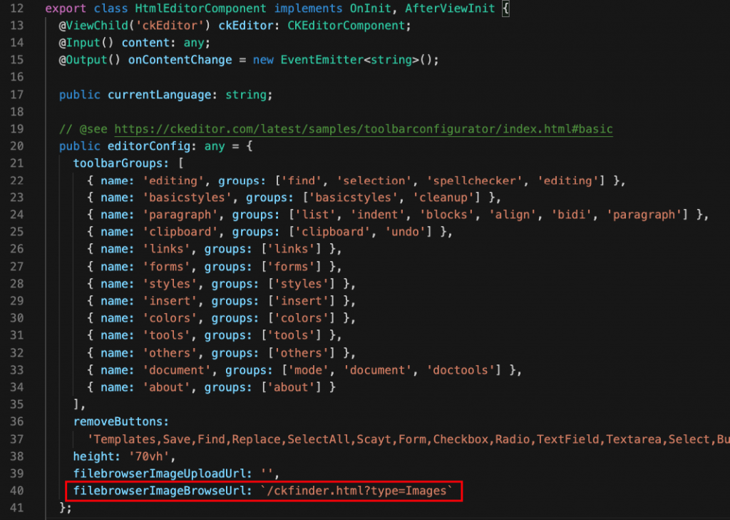 Việc tích hợp CKEditor trên Angular thì rất đơn giản rồi, ngay chính trên tài liệu hướng dẫn của CKEditor cũng đề cập đến việc tích hợp này. Tuy nhiên, để CKFinder hoạt động được thì nó phải được cài ở phía backend (để còn xử lý, thao tác với các file trên server nữa). Hiện tại thì CKFinder chỉ hỗ trợ mấy ngôn ngữ như PHP, Java, ASP, ASP.NET, ColdFusion.