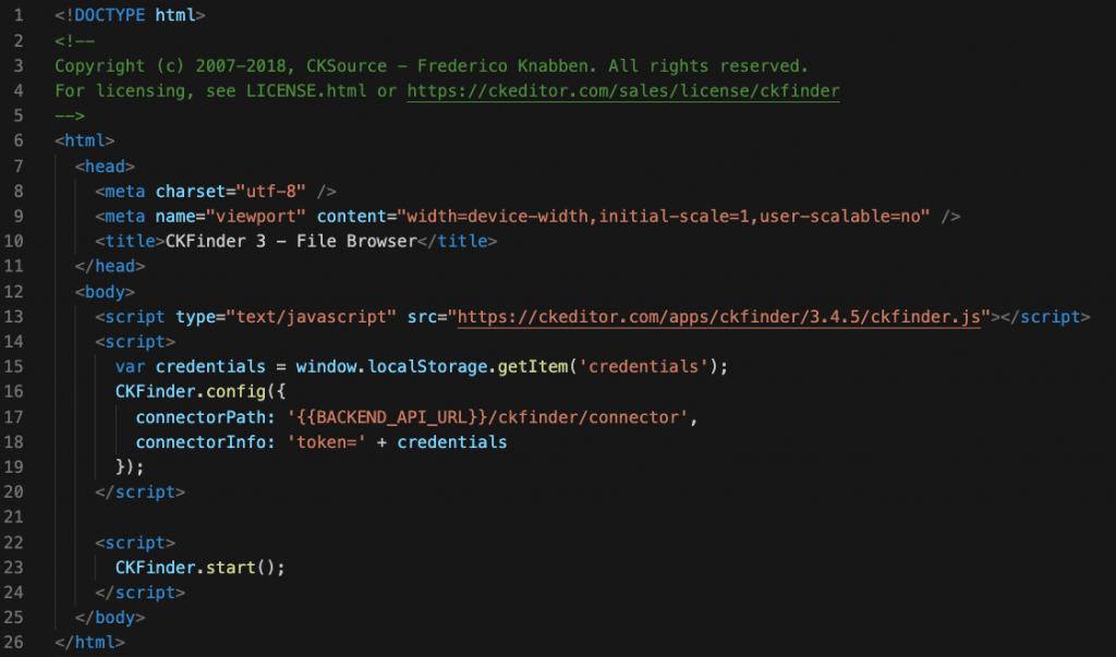 để khi build frontend nó sẽ tự động tìm & thay thế bằng đường dẫn đến backend của môi trường tương ứng (bạn nào cần script build & replace này thì để lại comment nha) - Nhồi thêm token khi call sang CKFinder ở backend: tất cả cả request mình đều để middleware để check login cả cho nên cần thêm cái token này thì mới request được 😎