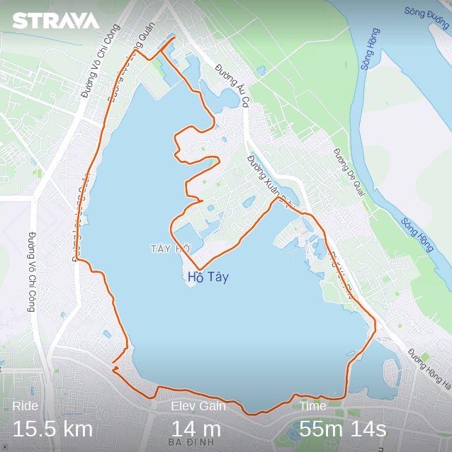 Chu vi 1 vòng quanh hồ Tây thì tầm khoảng 15-16km, đạp túc tắc thì cũng gần 1 tiếng (có hôm mình đạp xe lúc trời có vẻ sắp mưa nên cong mông đạp về, kết quả là hôm đó đạp mất có 30-40'). Dưới đây là lộ trình 1 lần đạp xe của mình bằng app Strava (cũng bật cả Samsung Health nhưng do toàn quên Galaxy Fit nên nó đíu đo được gì cả):
