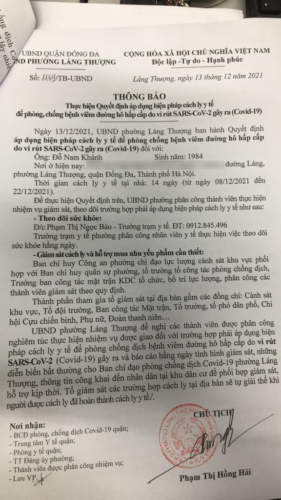 Theo đúng quy trình thì mình tra cứu số y tế phường để khai báo. Tuy nhiên do là ngày cuối tuần nên gọi điện hoài không được. Chờ đến thứ 2 mình phi lên phường khai báo thì các chị bên y tế phường bảo: F1 đi cách ly tập trung em nhé 😱 Bỏ mẹ, mình thuộc quận Đống Đa, tức là 1 trong 4 quận nội thành mà F1 bắt buộc phải đi cách ly tập trung.